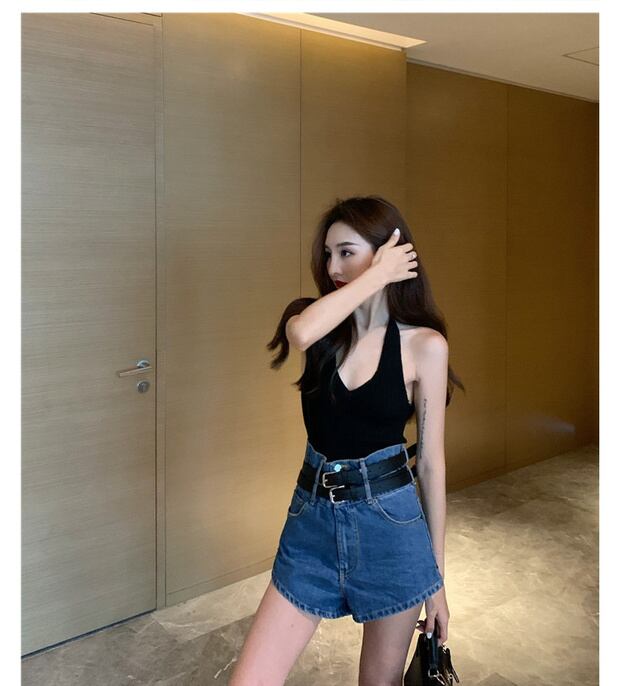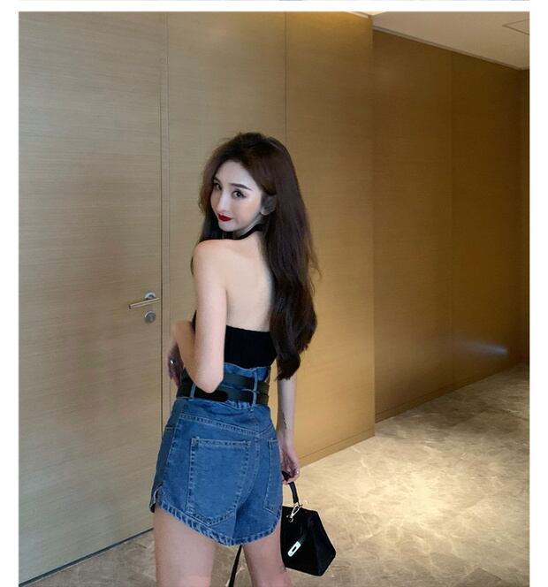 ジーンズ サマー薄手ルーズAラインショーツ パンツ ベルト 夏物 ハーネス ブルマー ブラックストロベリース28698518202