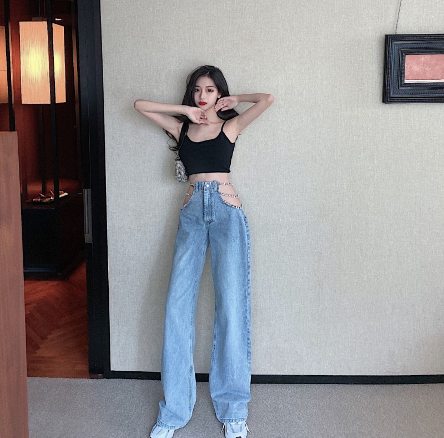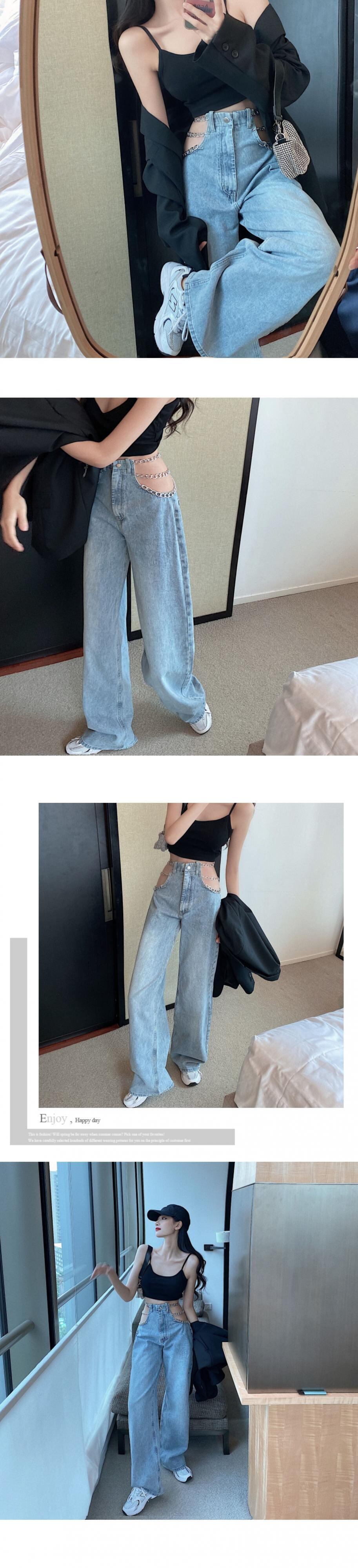 センスチェーンストレートジーンズ女性秋の薄いワイドレッグパンツ2020新しい緩いモップパンツ ブラックストロベリース275477105