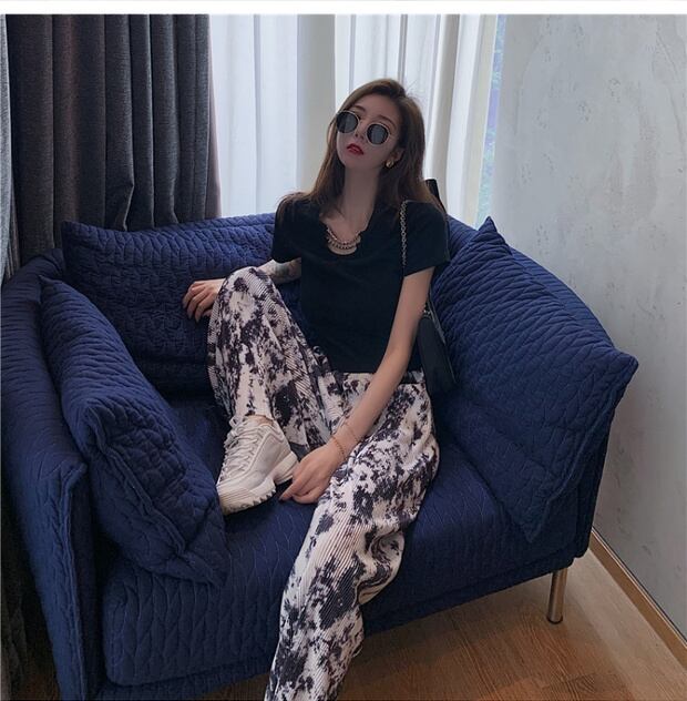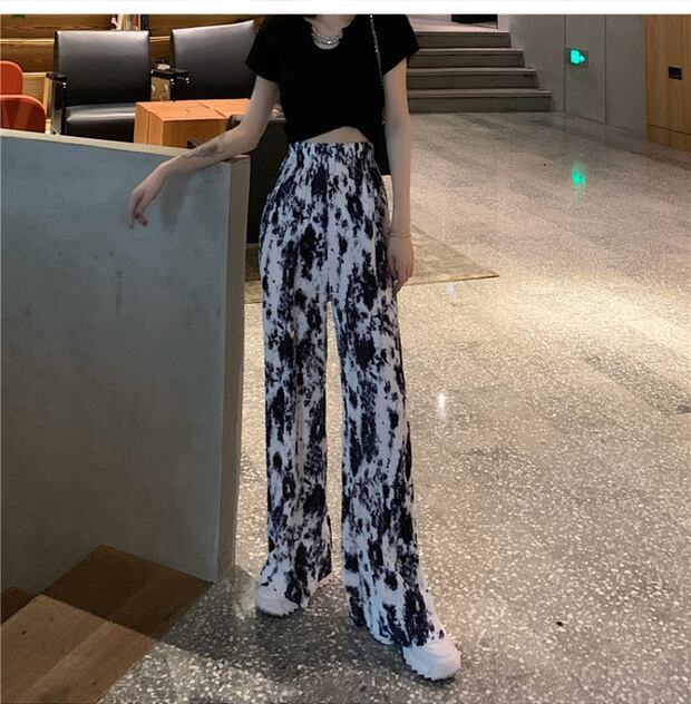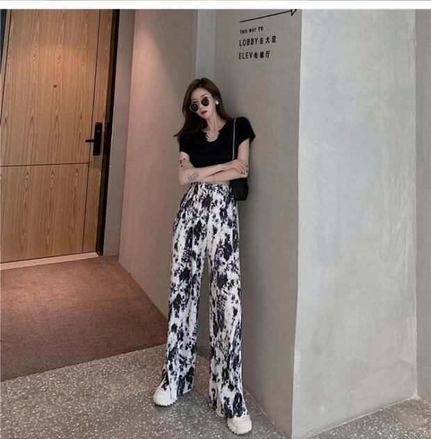 バージョンの黒の絞り染めワイドレッグカジュアルパンツ女性の夏の緩いドレープハイウエストのズボン2020新しいストレートパンツ ブラックストロベリース60118871084