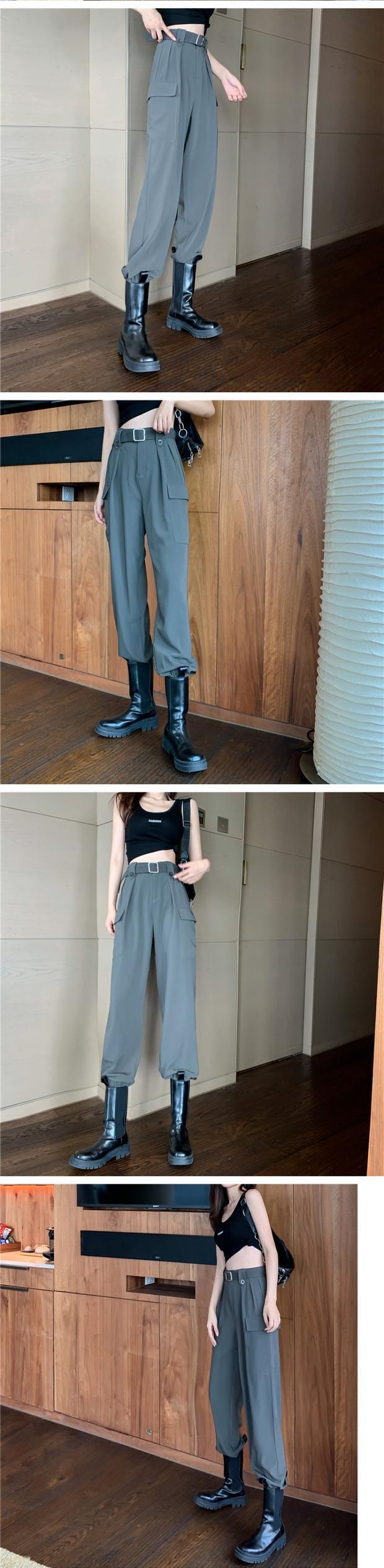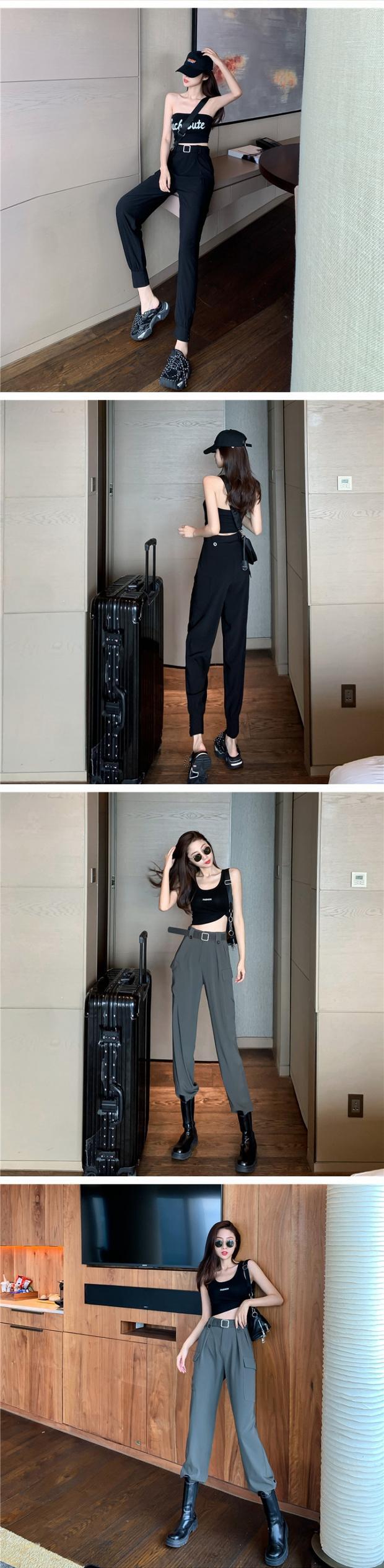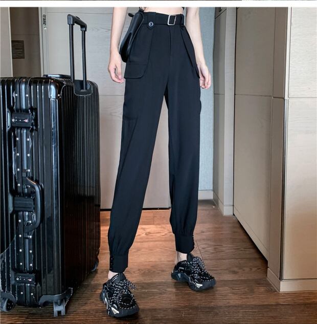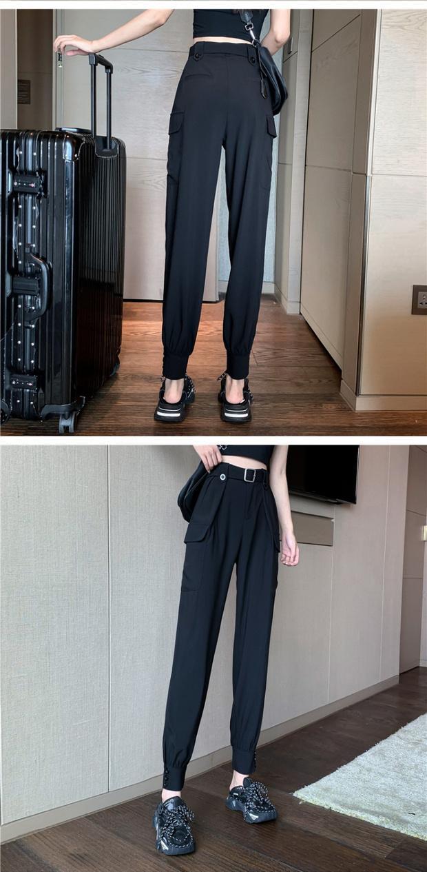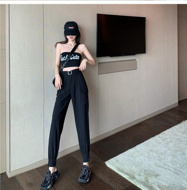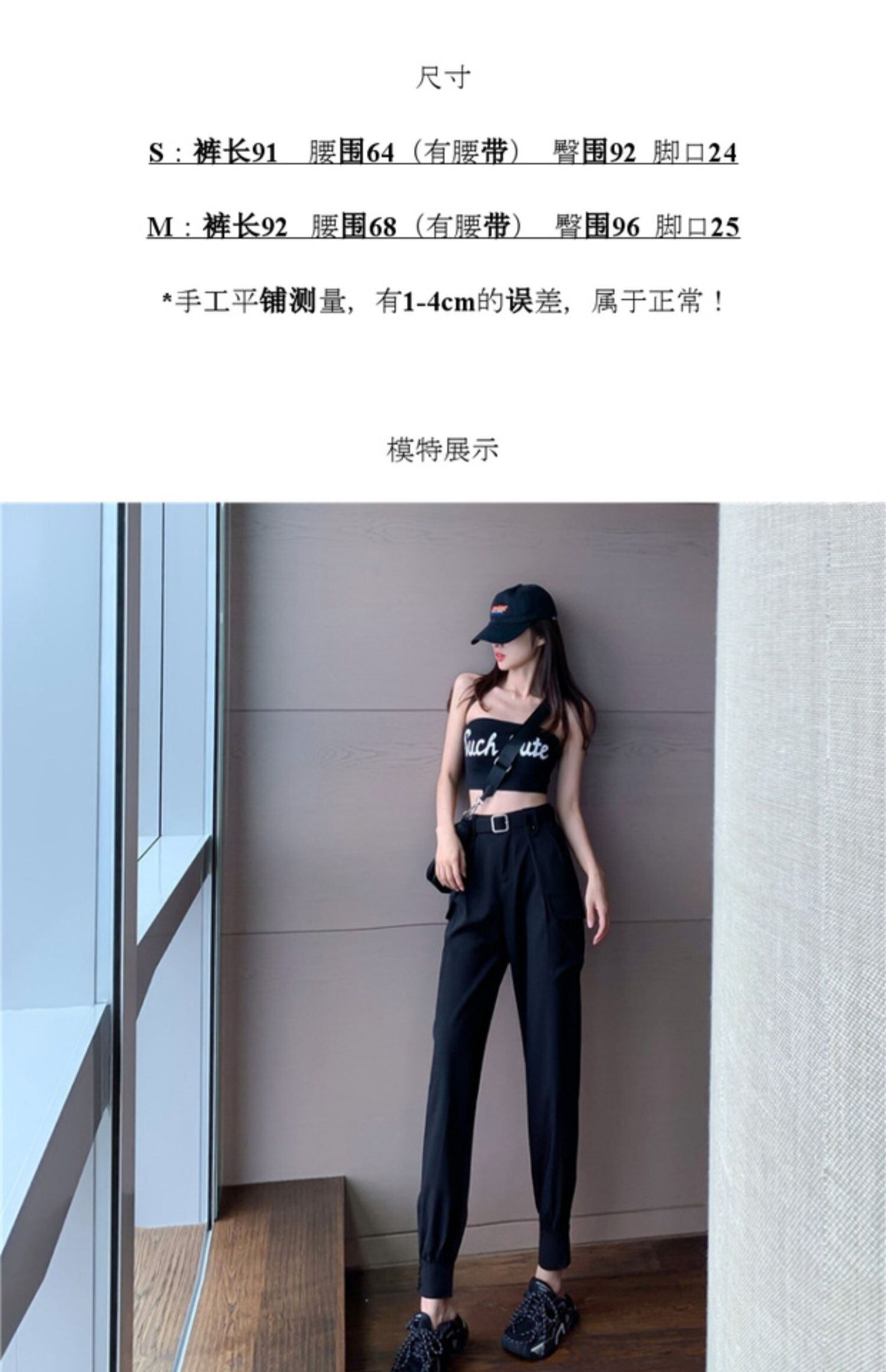 巾着オーバーオールカジュアルパンツ女性の夏の薄いハイウエストワイドレッグストレートパンツ2020新しいルーズパンツ ブラックストロベリース724642891
