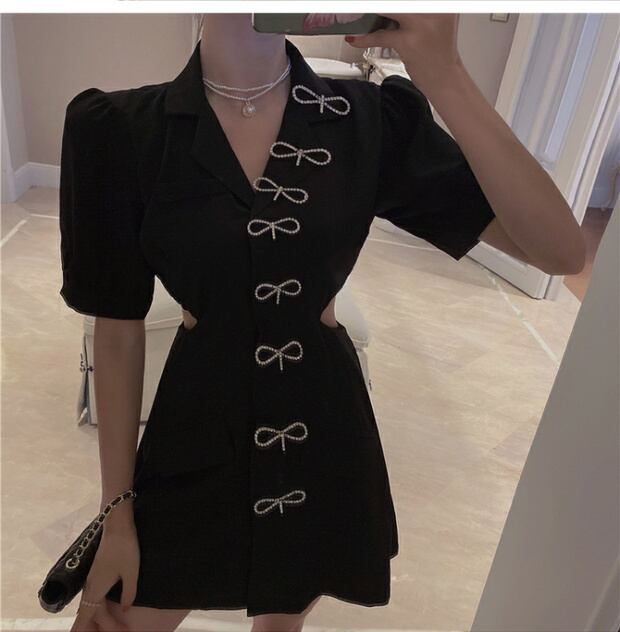 蝶ネクタイVネックブラックスーツショートスカート夏2020新しい女性の気質ウエストスカートスリムドレス ブラックストロベリース63040002985