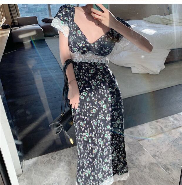 小さなデイジーフローラルレースミドル丈ドレスフレンチレトロ薄い気質ドレス女性の夏2020新しいスカート ブラックストロベリース86032478891