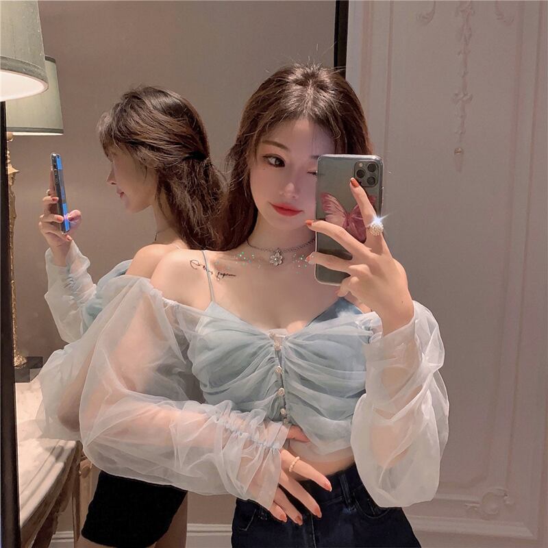 ネット糸日焼け止めシャツ女性の夏の薄い長袖の半袖シャツ2020新しい全試合フレンチニッチトップ ブラックストロベリース35108112577