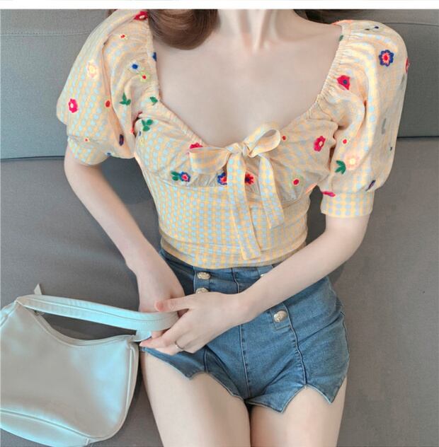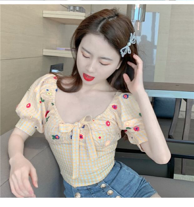 格子柄刺繍フローラルブラウス サマーシャツ 夏物 花柄 ブラックストロベリース14934254966
