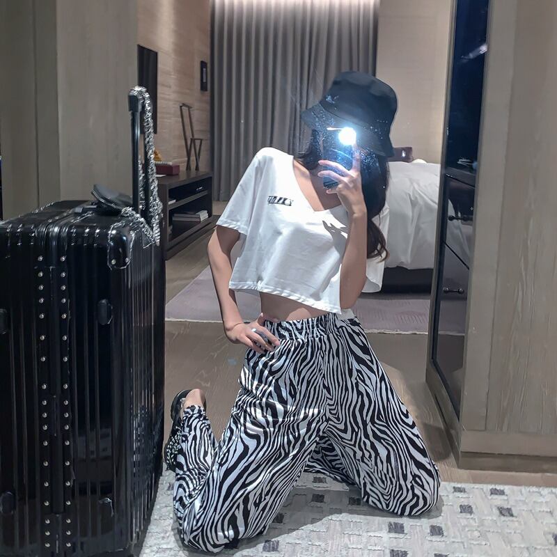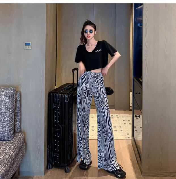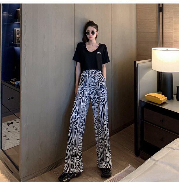 ゼブラ柄アイスシルクカジュアルハーレムパンツレディース夏薄手ハイウエストワイドレッグ2020新作ドレープロングパンツ ブラックストロベリース6851150841