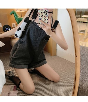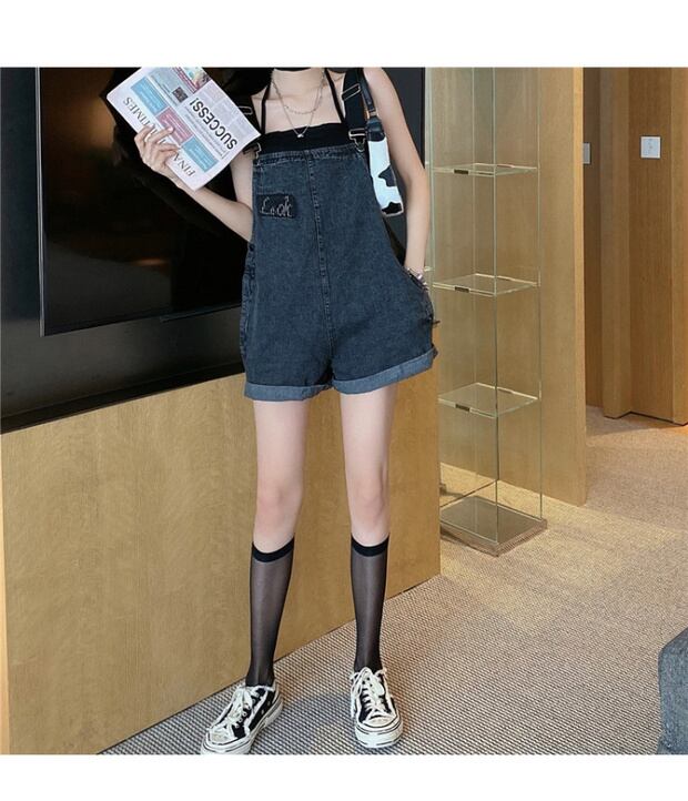 作業服ストラップワンピースジーンズレディース夏薄手ゆったりハイウエストワイドレッグショートパンツ2020新作パンツ ブラックストロベリース42114640497