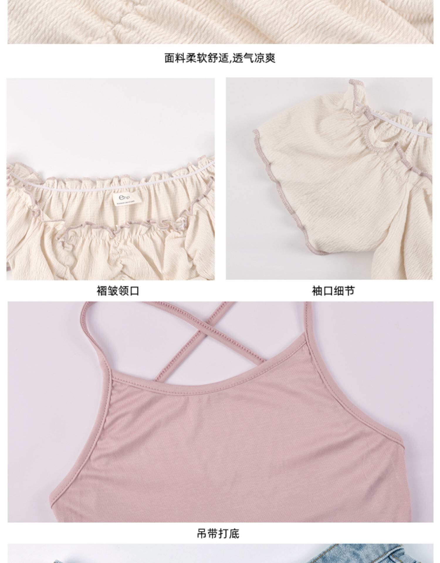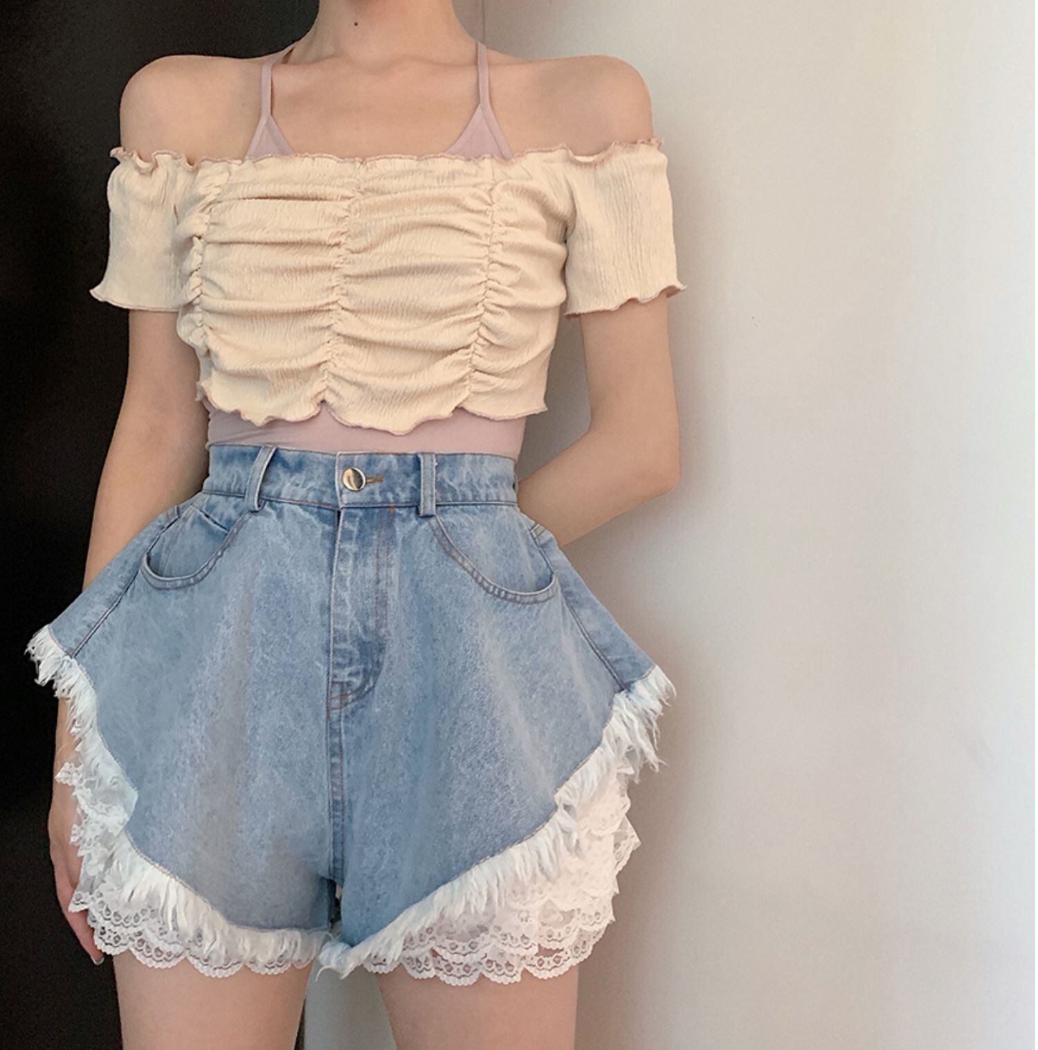 色:デニムショートパンツ,レースレギンス,プリーツブラウス,スリングボトムシャツ