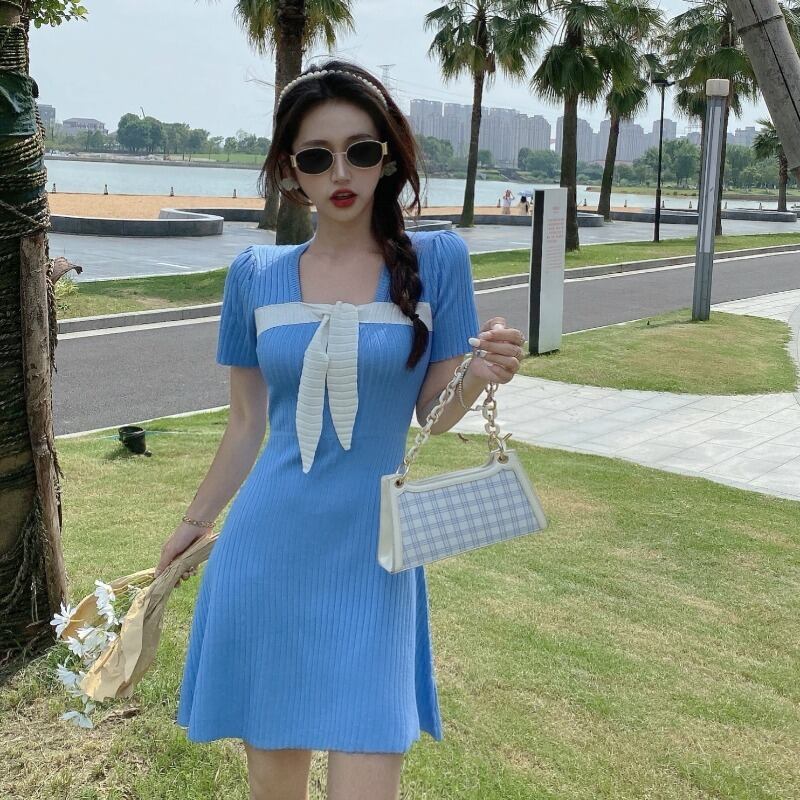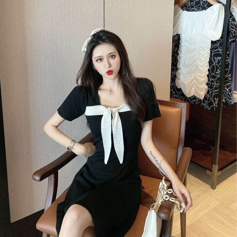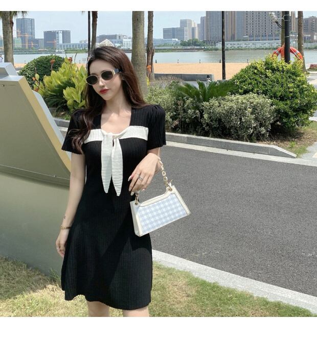 リボンカラードレス レディースニットブラックAラインショートスカート サマー薄手 夏物 スクウェア ブラックストロベリース72927634904
