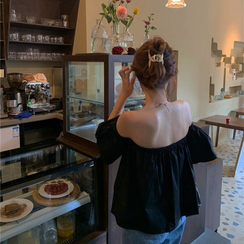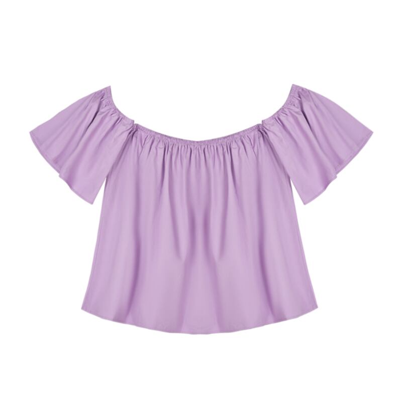 フレンチワンライン襟半袖シャツ女性の夏のストラップレスセクシーな注意深いマシンシャツ2020新しい紫トップ ブラックストロベリース81258261086