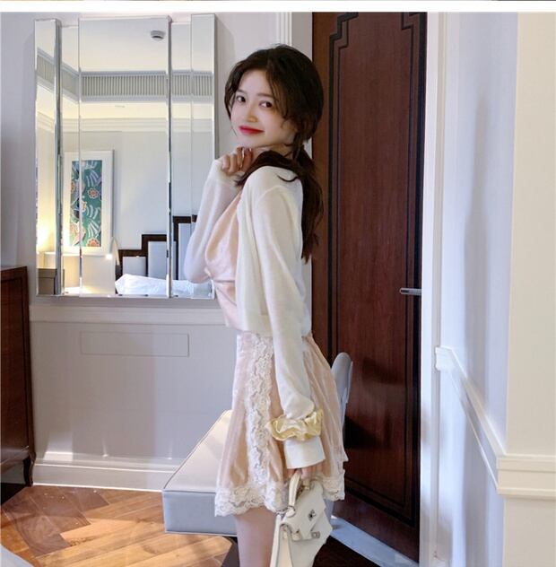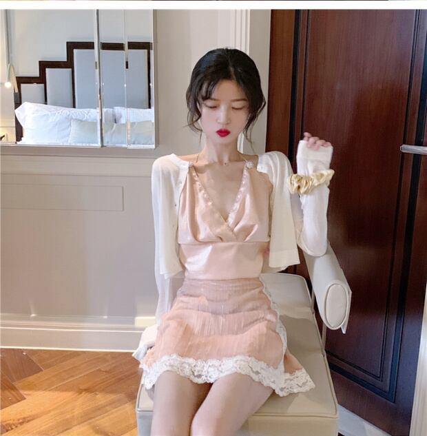 色:ガーデニアピンクダイヤモンドスリング,ガーデニアピンクスカート,暖かく白いカーディガン