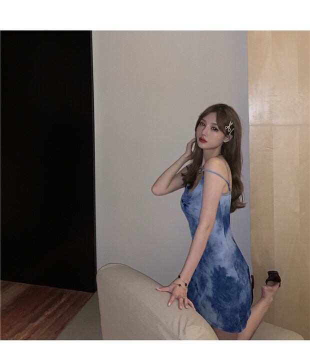 タイダイブルーのセクシーな小さなサスペンダードレスの女性の夏のAラインノースリーブスカート2020新しいバッグヒップスカート ブラックストロベリース46049623276