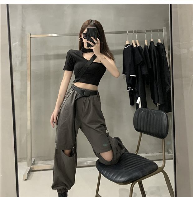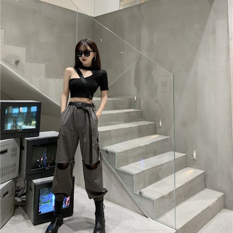巾着カジュアルスーツパンツ女性の夏のストレートルーズルーズ取り外し可能なズボン2020新しい薄いハイウエストパンツ ブラックストロベリース72761317895