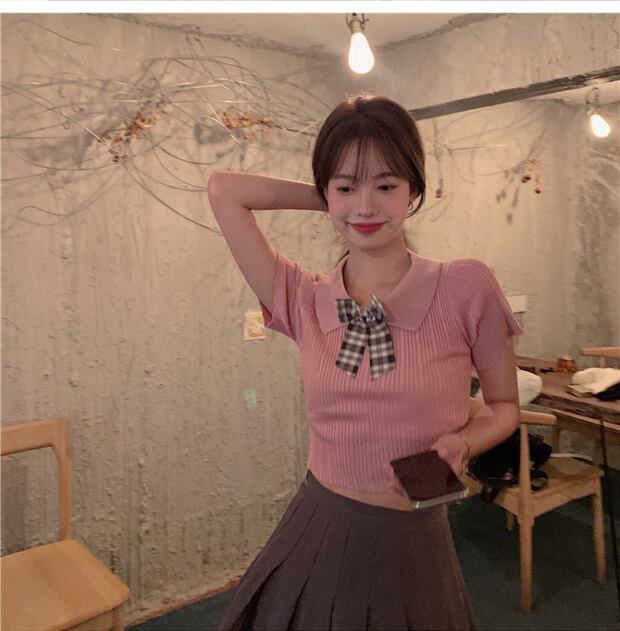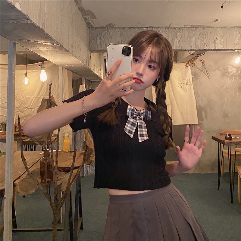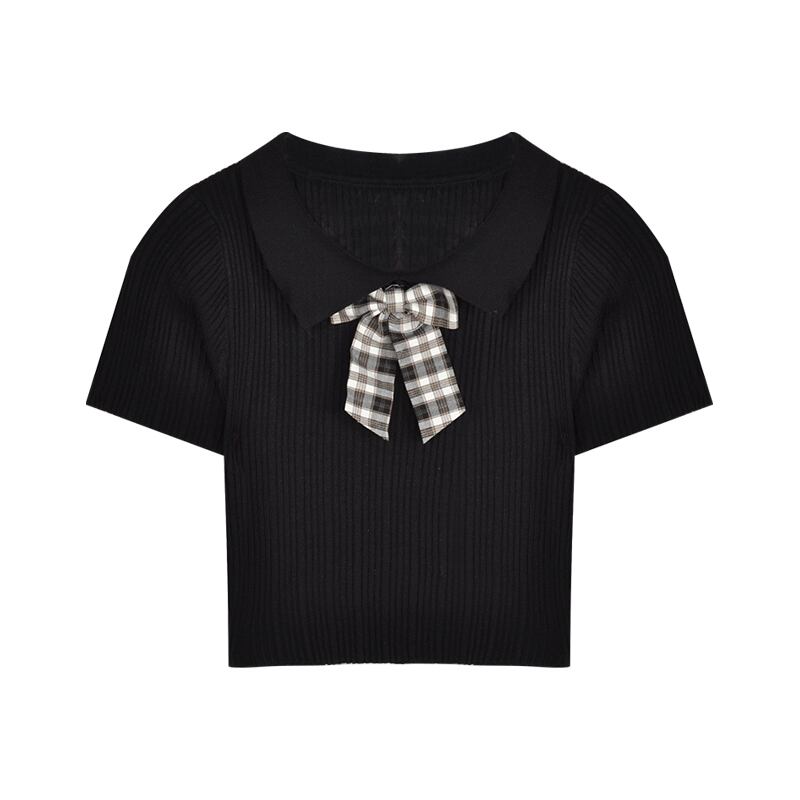 ちょう結びの黒のニットポロシャツの女性の夏の短い氷のシルクスリム半袖2020新しい薄いトップ ブラックストロベリース55558542455