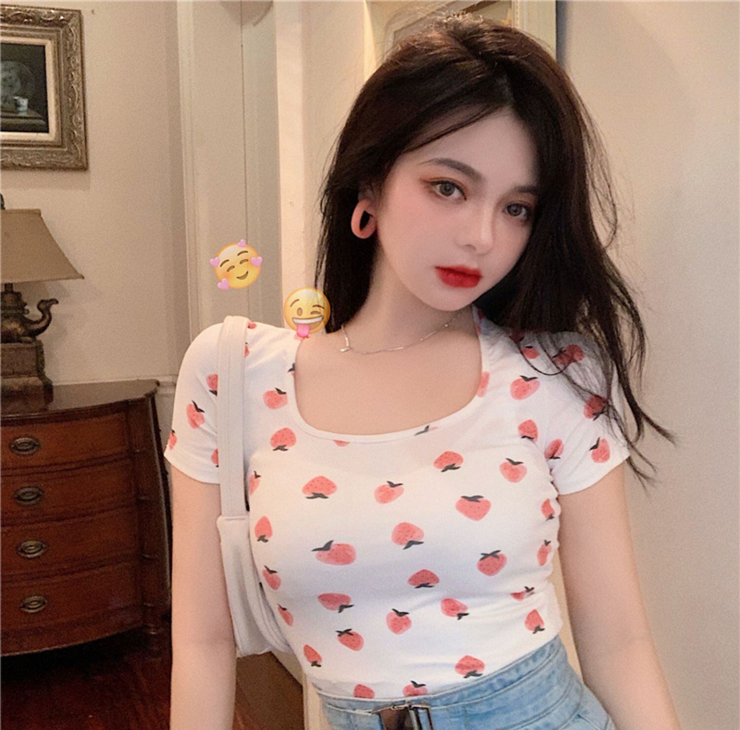 ショートクロップトップ トップス サマーニットハイウェストウェスト半袖スリーブTシャツ ハーフスリーブ 夏物 シルク ブラックストロベリース57043075084