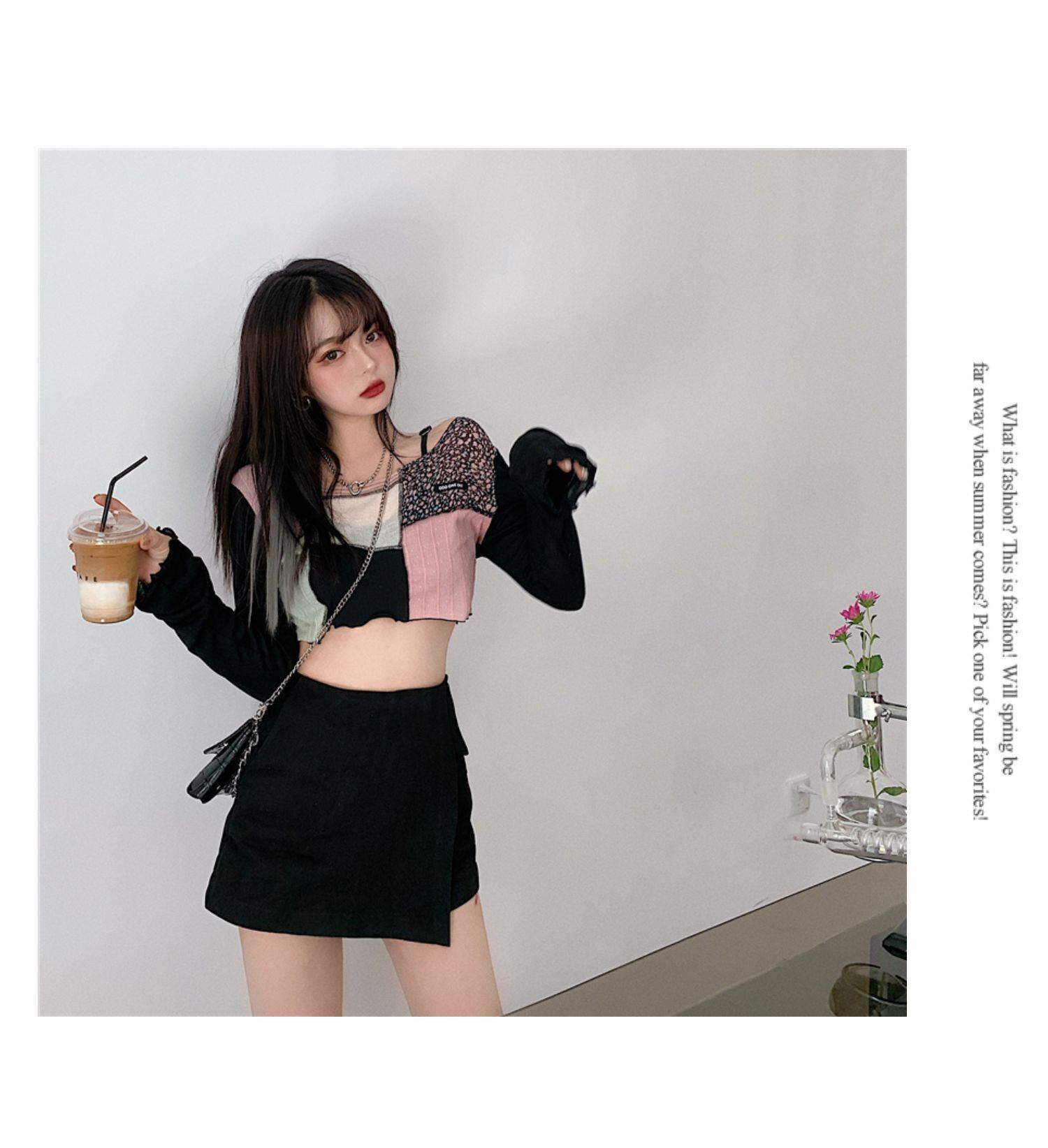 コントラストカラーステッチ長袖日焼け止めTシャツレディースサマースリムスリミングショートクロップトップ2020ニューブラック ブラックストロベリース48323174109