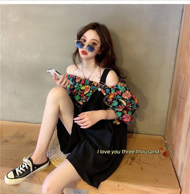 花柄ワンショルダートップレディースサマー薄手半袖シャツ2020新デザインセンスニッチパフスリーブシャツ ブラックストロベリース80497894933