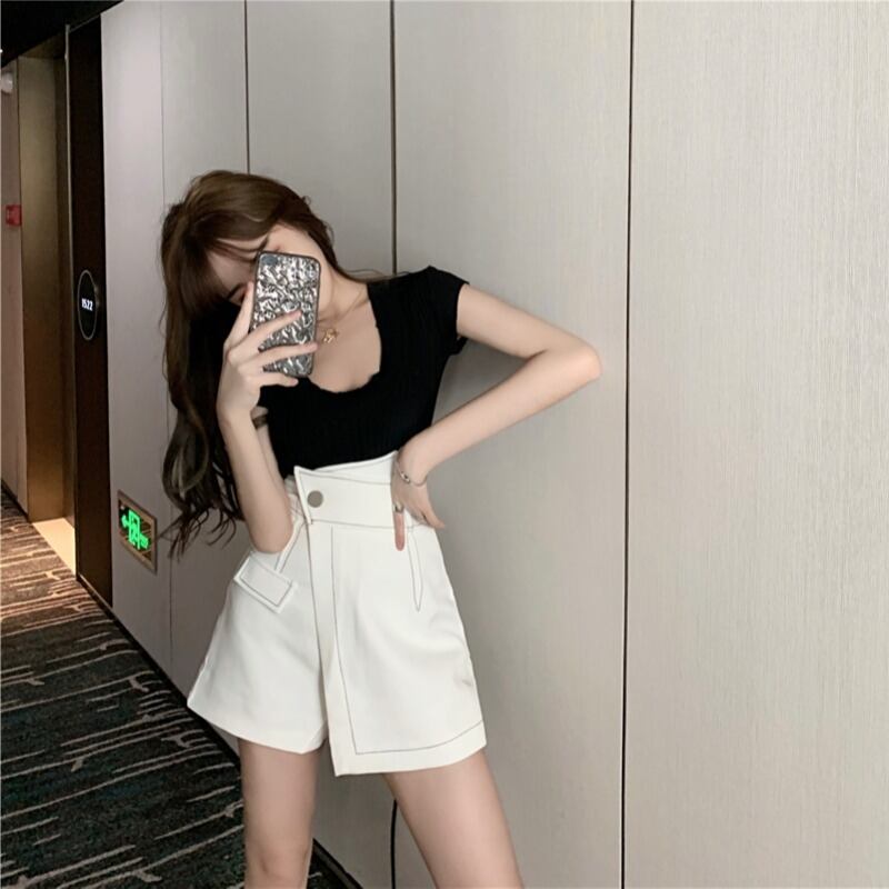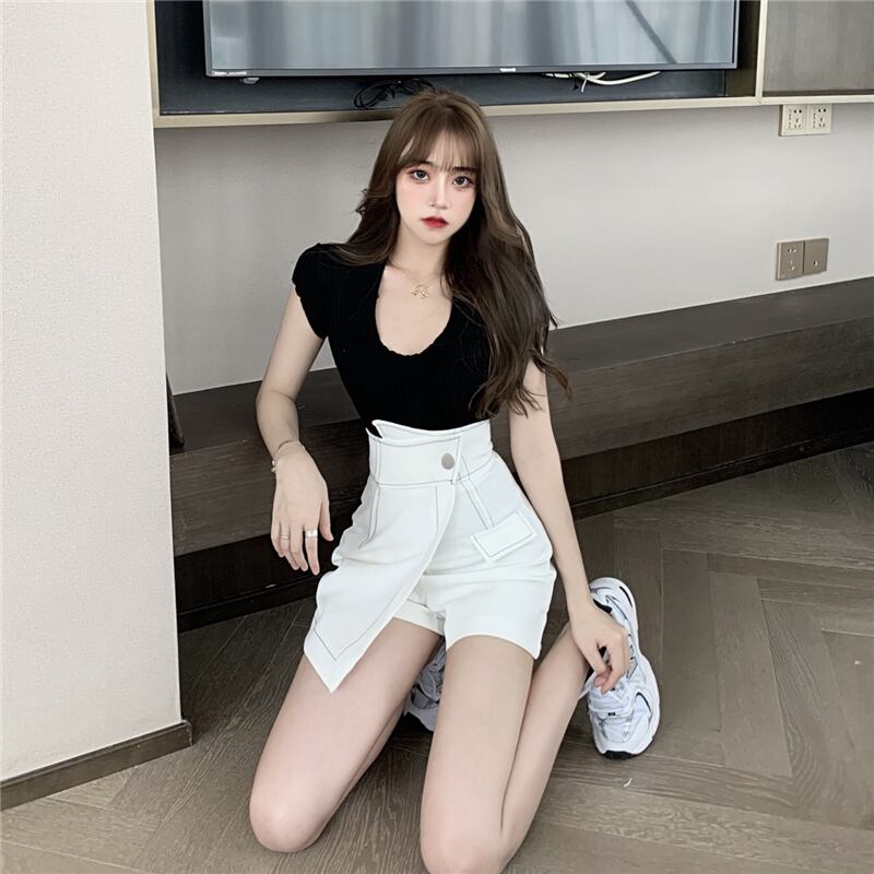 洋風エイジリダクションスーツレディースサマー半袖ニットシャツ2020新ハイウエストデザインセンスキュロットツーピーススーツ ブラックストロベリース82903504561
