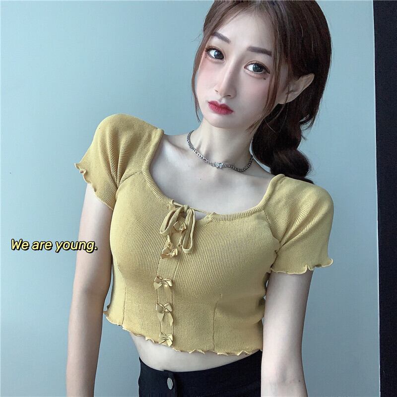 キャンディーカラーのカーディガンレディースサマーレースアップボウショート半袖シャツ2020ニュースタイルニットシントップ ブラックストロベリース7138143647