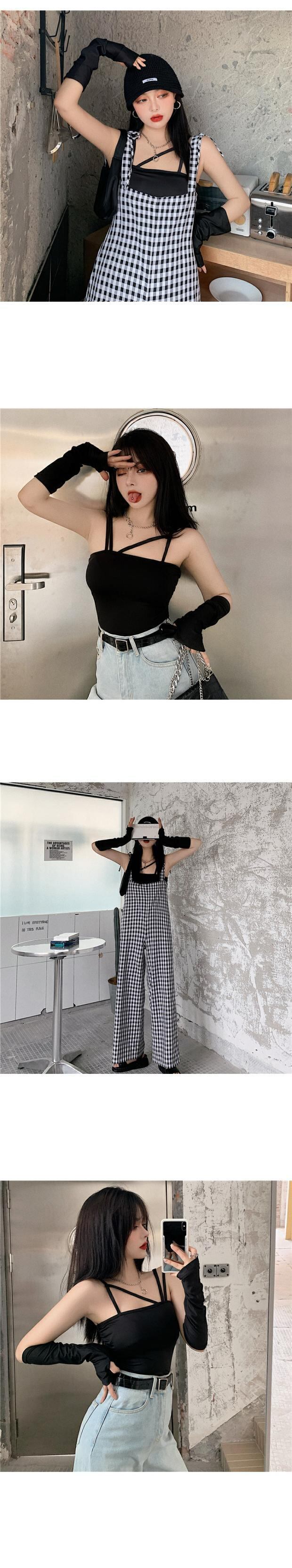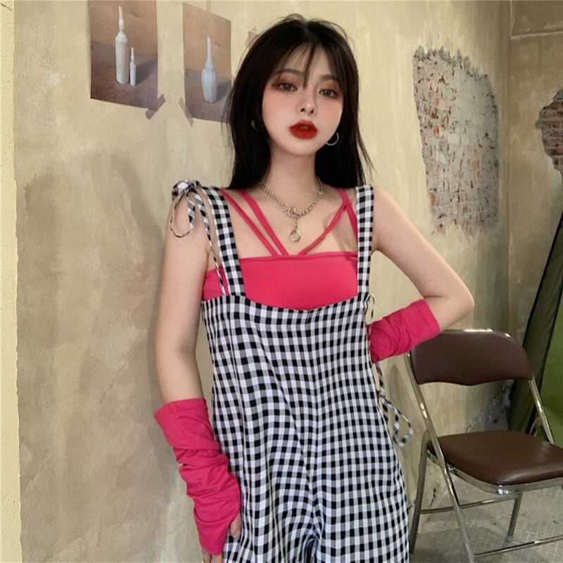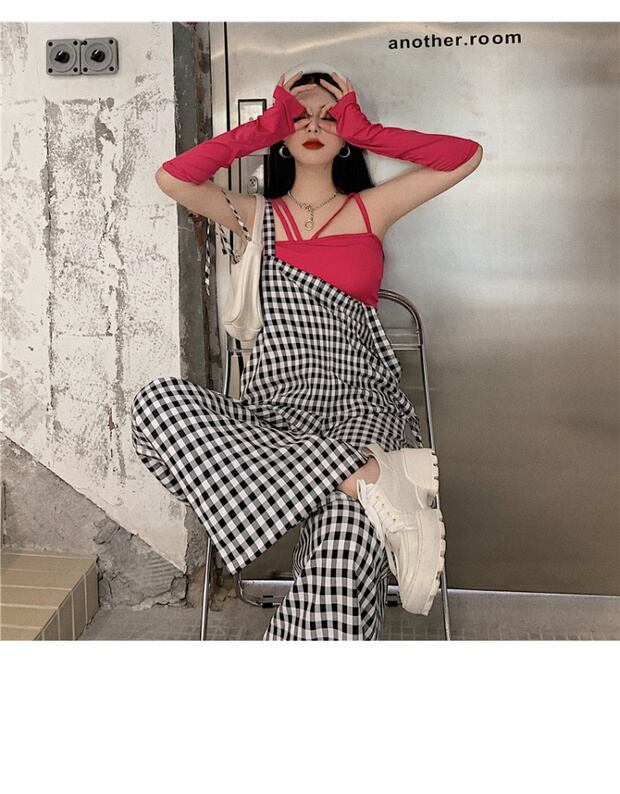 洋風ファッションスーツレディースサマーハンギングネックデザインセンスブラウス2020新チェック柄ビブツーピーススーツ ブラックストロベリース74901111610