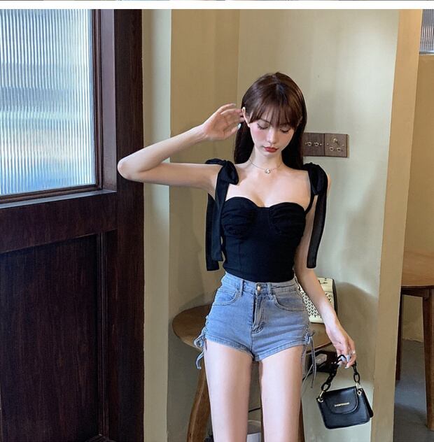 ブラックボウノットノースリーブスモールスリングレディースサマーセクシーインナーベースベスト2020新しいアウターウェアトップトレンド ブラックストロベリース10012444601