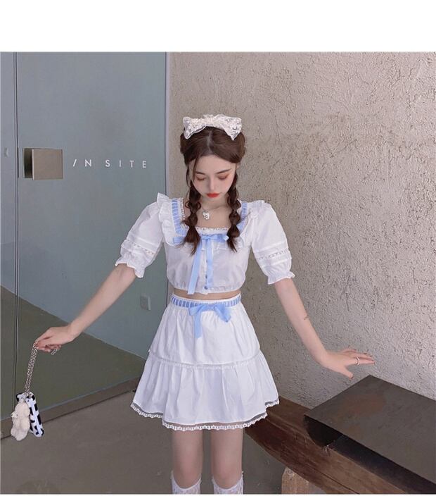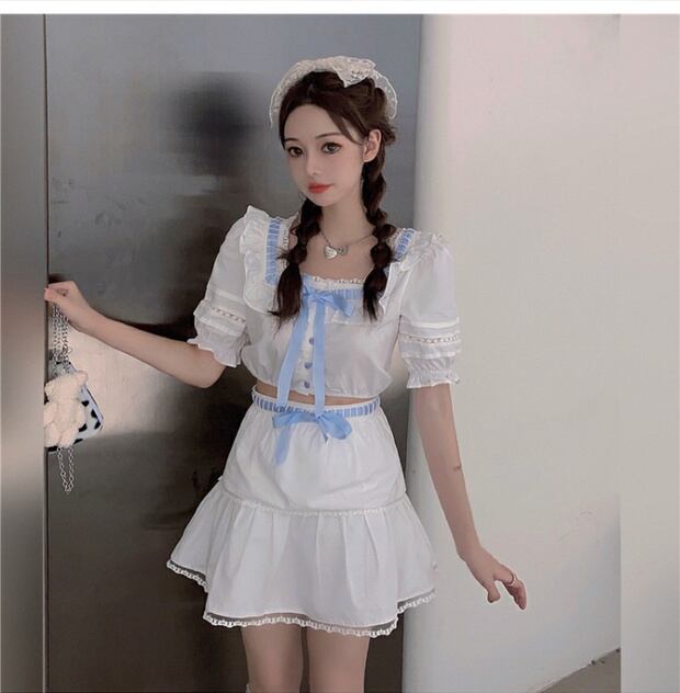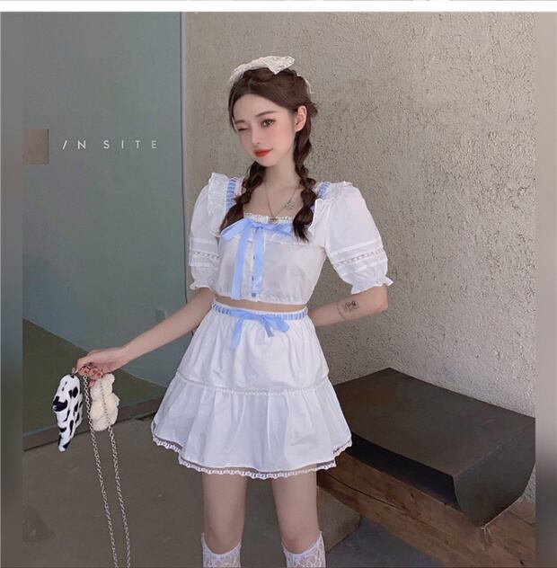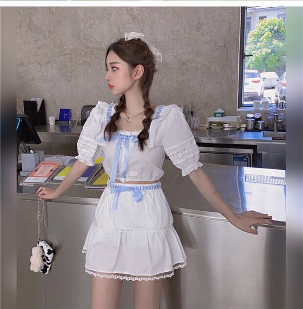 フレンチスクエアカラーボウノットパフスリーブシャツレディースサマーデザインニッチシャツ半袖ホワイトレーストップ ブラックストロベリース85895999996