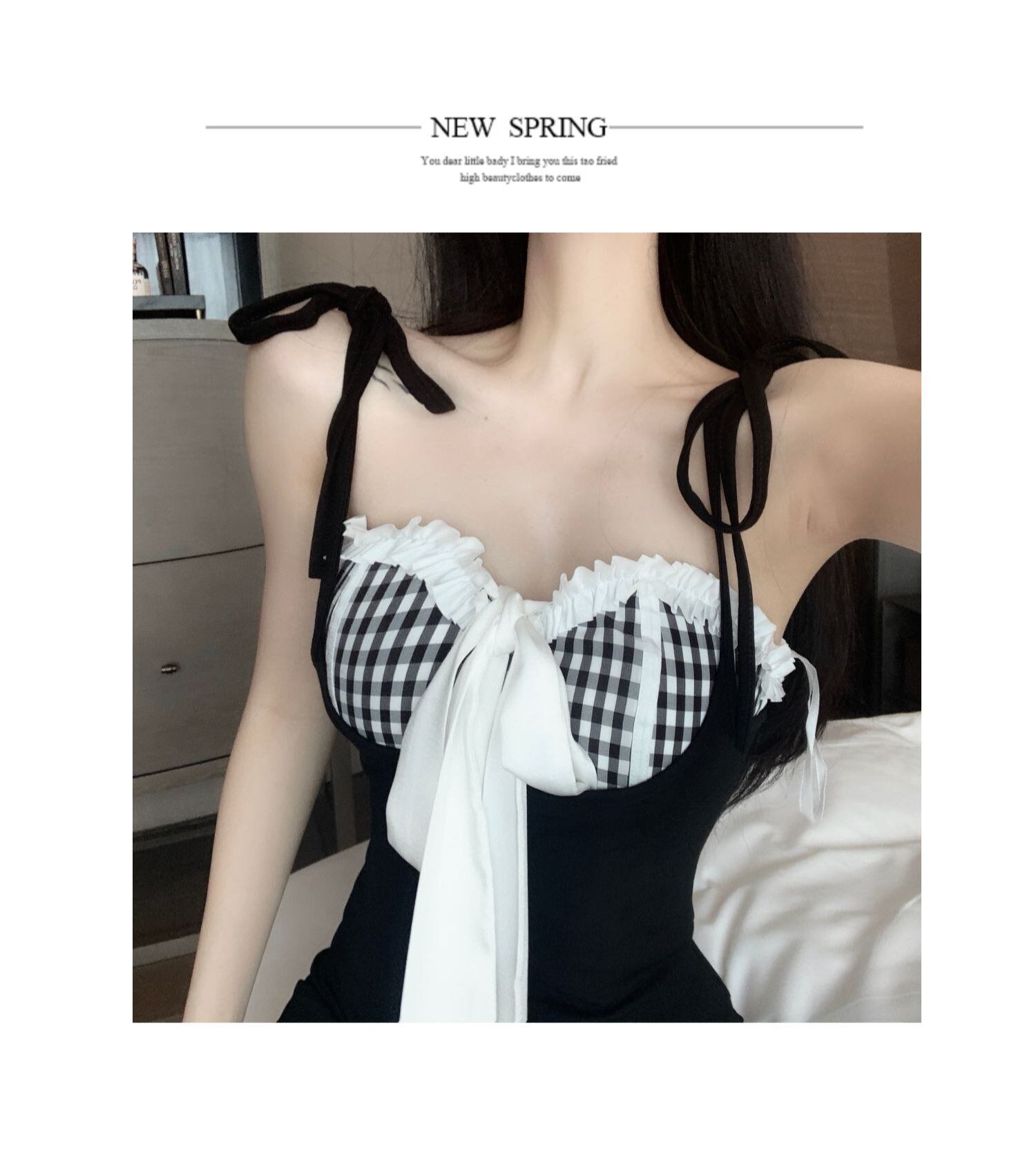 色:チェック柄チューブトップ,ストラップドレス,ニットカーディガン