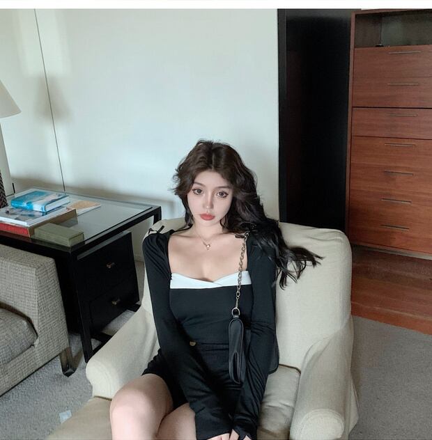 秋のタイトフィット長袖Tシャツ女性のフェイクツーピースデザインセンス ブラックストロベリース31021341489