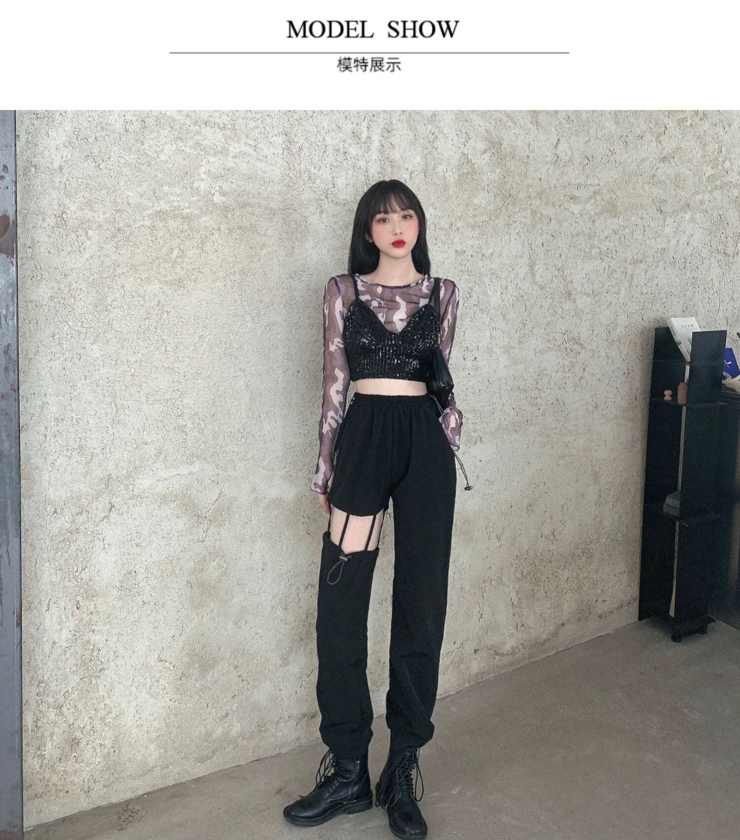 黒の破れたツーリングハーレムパンツ女性の秋ルーズで薄いカジュアルパンツストレートハイウエスト薄いパンツ ブラックストロベリース83364895567