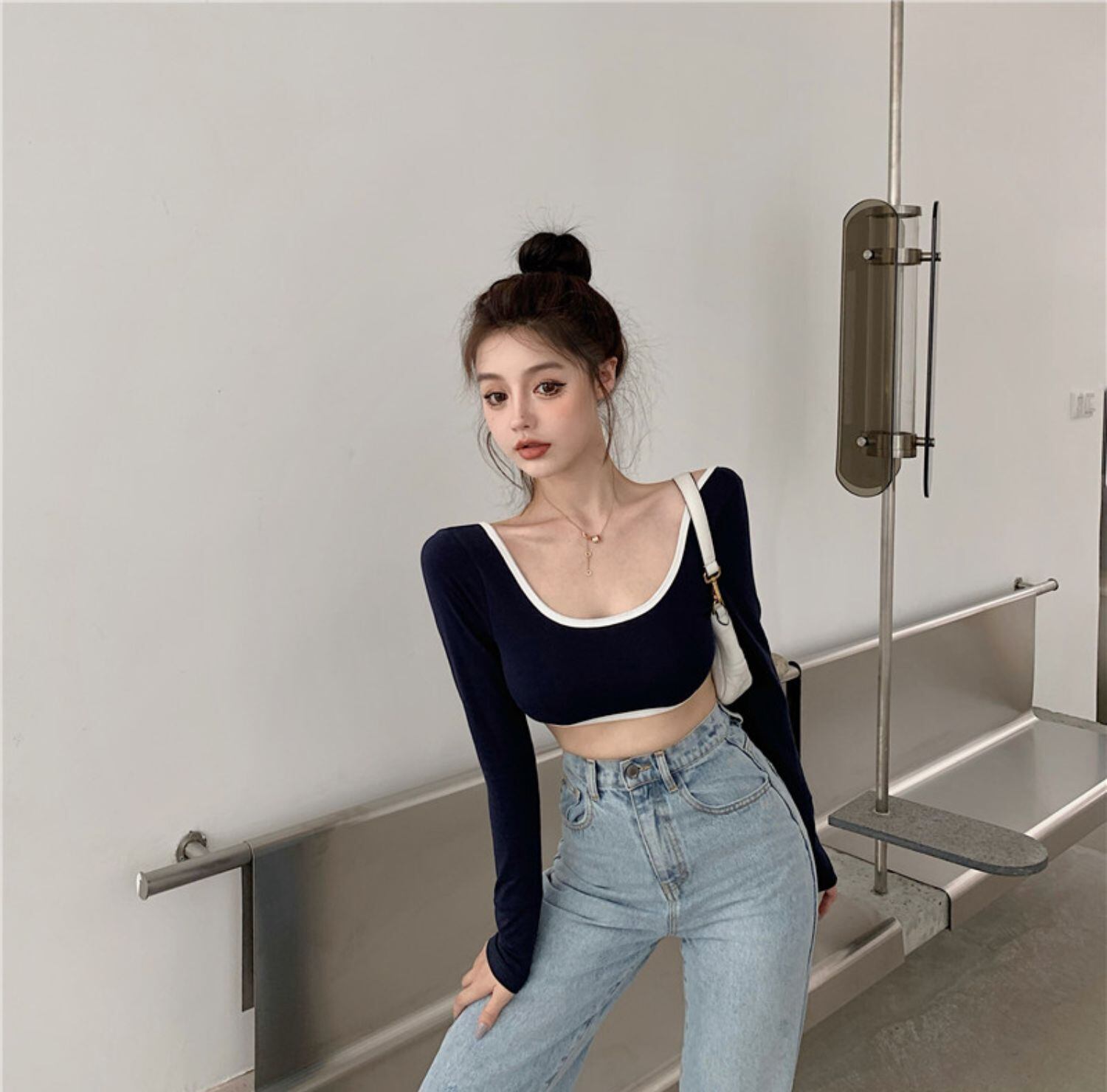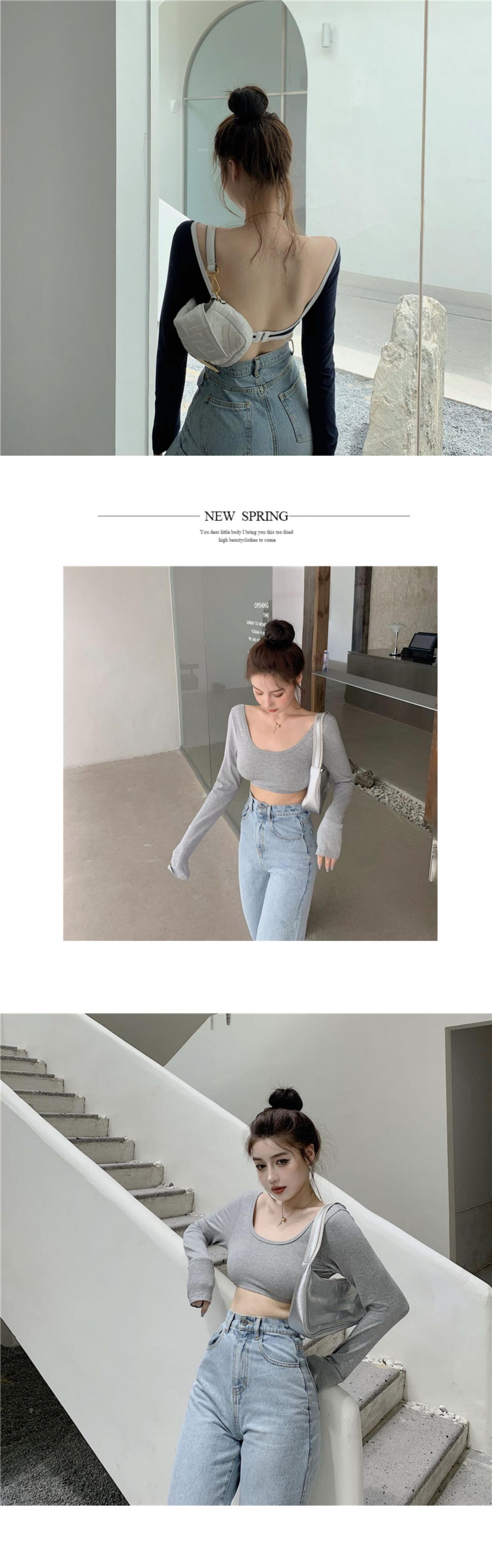 グレーの大きなUネック超短Tシャツ女性の夏のセクシーな自己栽培へそ長袖2020新しいオープンバックハイウエストトップ ブラックストロベリース3353868171