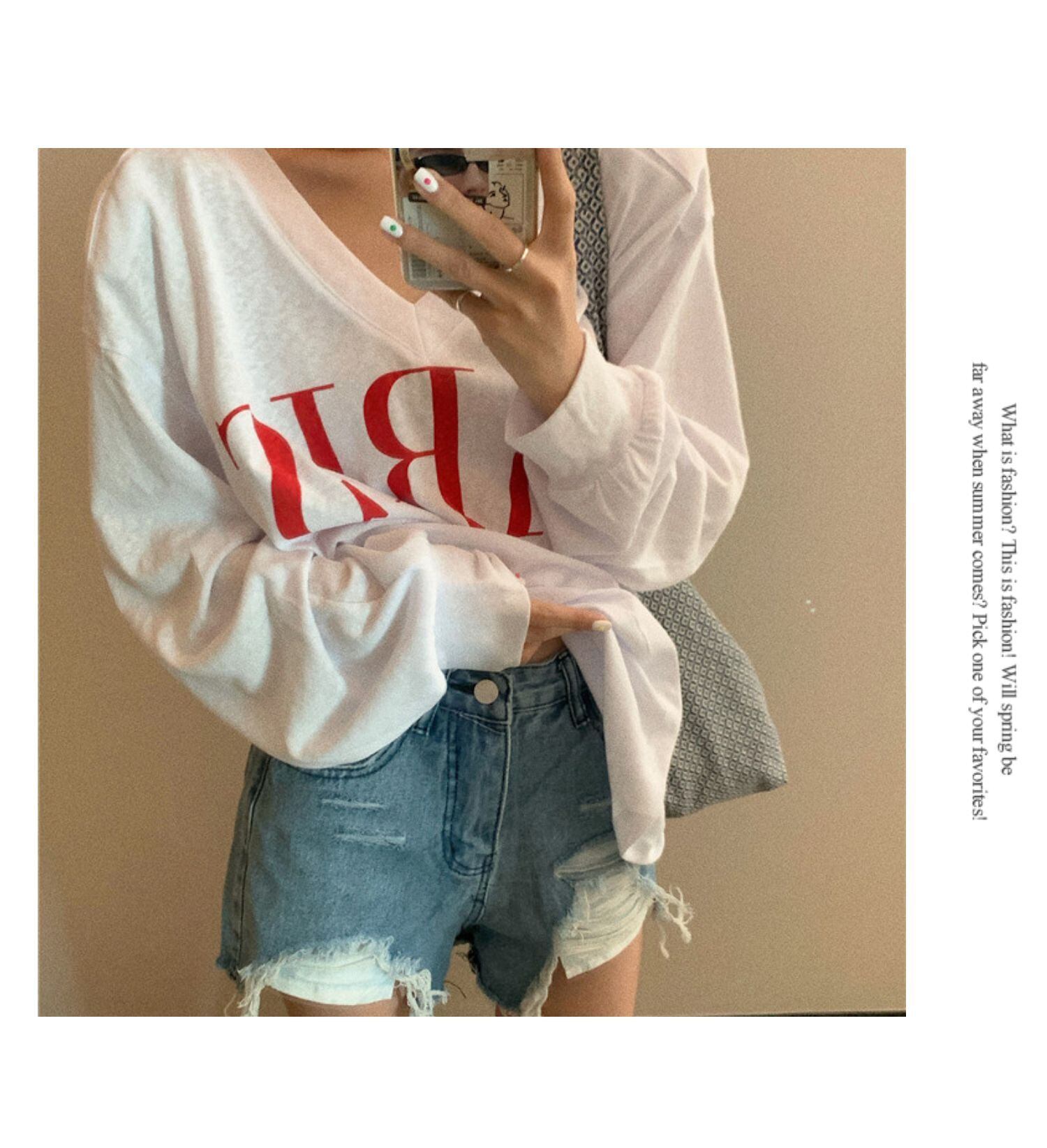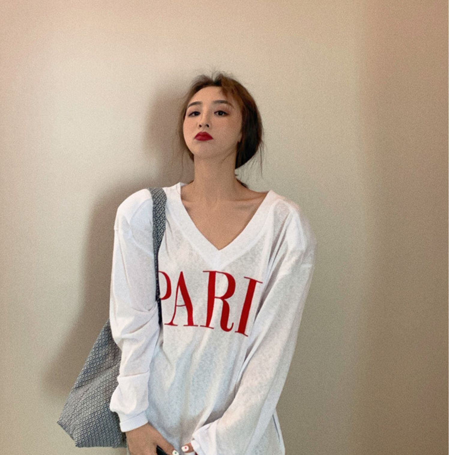怠惰なスタイルのカジュアルな長袖トップレディースバージョンのVネック秋のラージバージョンルーズミドル丈の白いTシャツの潮 ブラックストロベリース41699162208