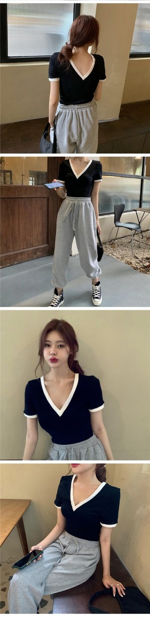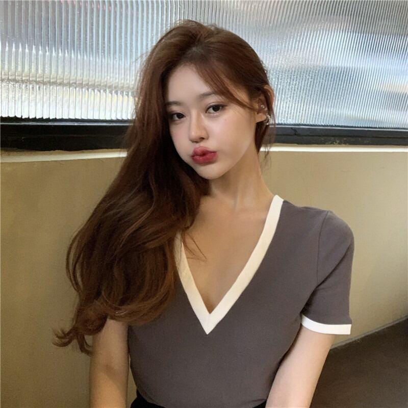スリムショートブラックTシャツ女性夏イントレンディなVネックスリム半袖Tシャツ2020ニュートップのバージョン ブラックストロベリース25577626391