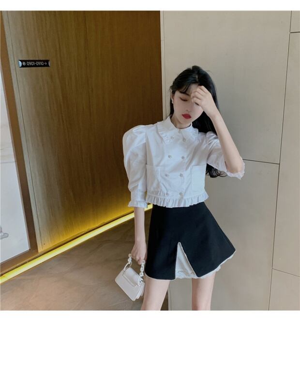 フランスのダブルブレスト白いシャツの女性の夏のパフスリーブ半袖シャツ2020新しいデザインセンスニッチトップ ブラックストロベリース30240497910