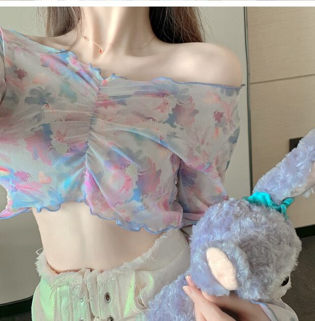 ルーズ絞り染めプリントメッシュTシャツレディースサマーストラップレスショートシンロングスリーブ2020ニュートップのバージョン ブラックストロベリース35346077763