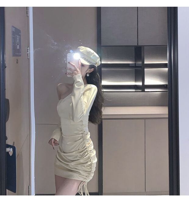 サテンのセクシーなオフショルダードレスの女性の夏の気質は薄くてヒップなショートスカート2020新しい長袖スカート ブラックストロベリース40759550217