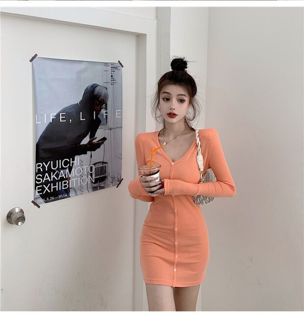 オレンジの長袖ニットドレス女性秋セクシータイトフィットヒップショートスカート2020新しいスリム気質スカート ブラックストロベリース33623071260
