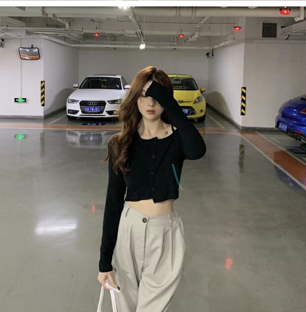 不規則な黒のTシャツ女性の初秋はセクシーなストラップレス長袖ボトミングシャツ2020新しいショートトップに注意してください ブラックストロベリース98003291265