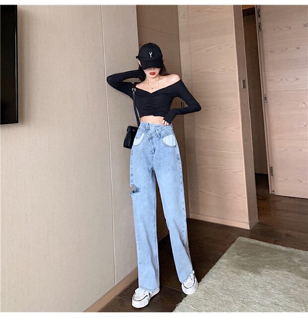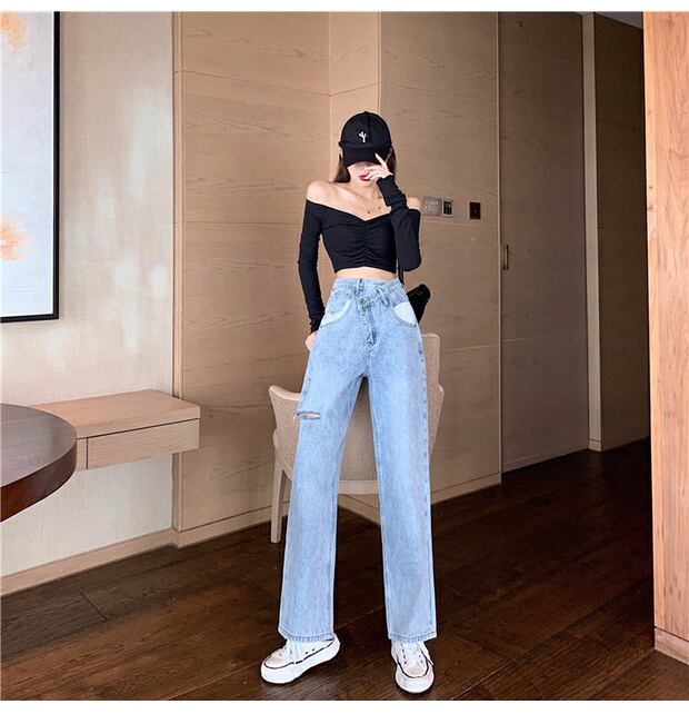 レトロなハイウエスト破れたジーンズ女性の2020年秋新しいズボンワイドレッグルーズストレートパンツイントレンド ブラックストロベリース73769929241