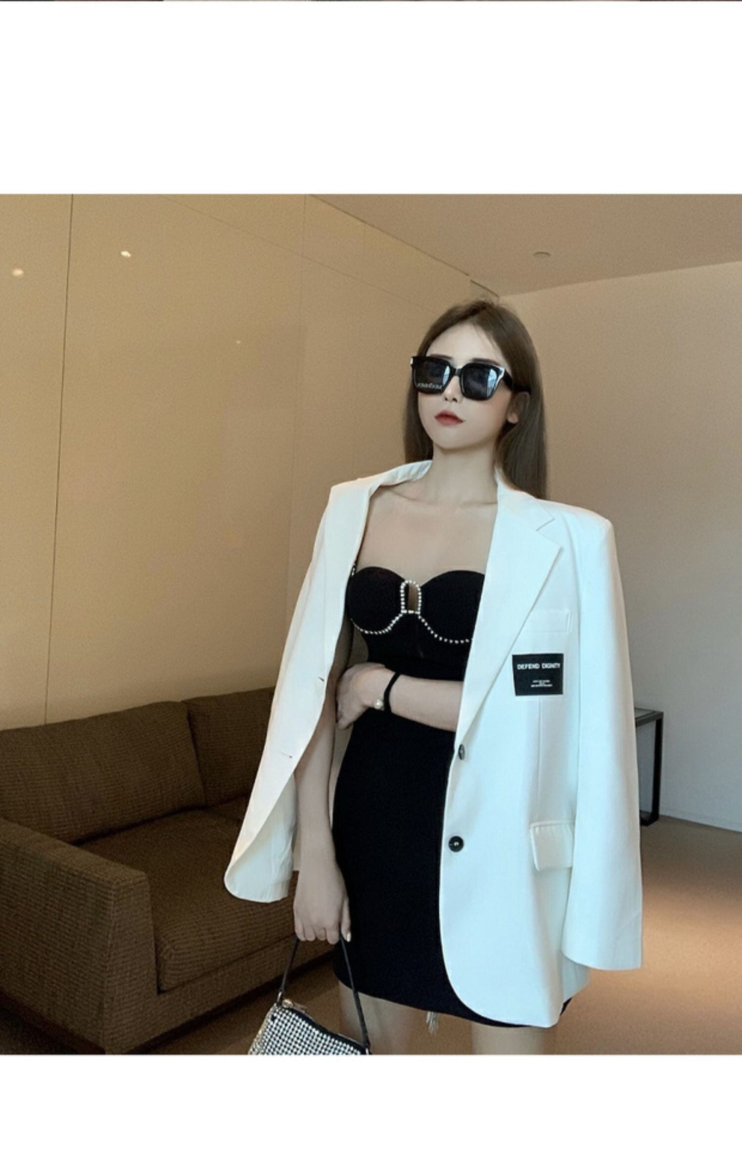 ホワイトカジュアルスモールスーツレディース初秋バージョンのルーズブリティッシュスタイルスーツ2020新しいミドル丈ジャケットジャケット ブラックストロベリース30996748808