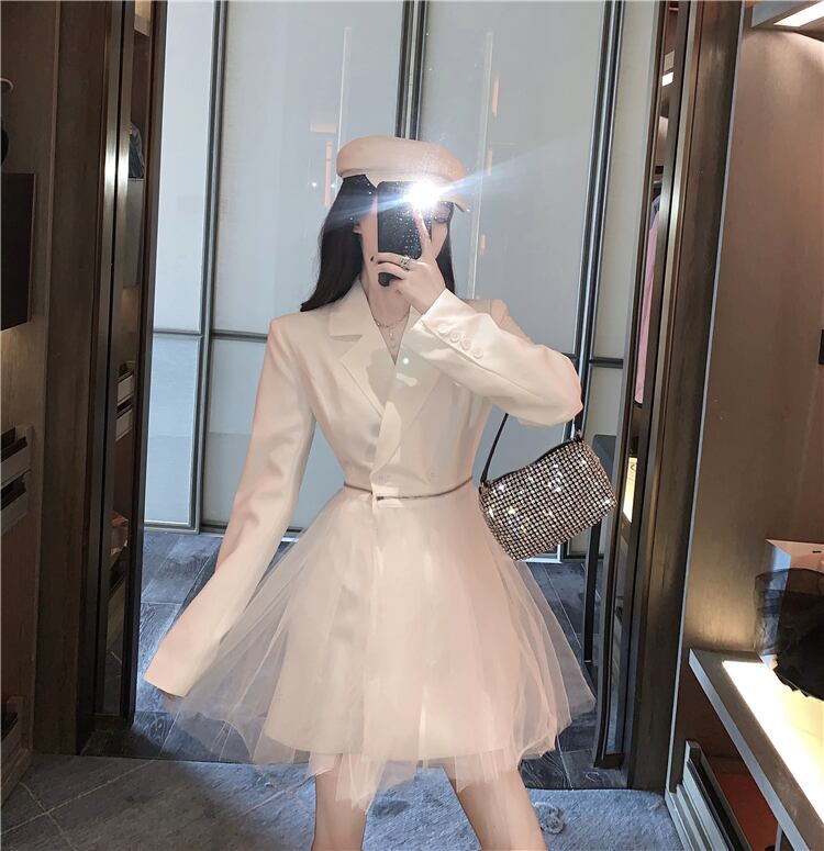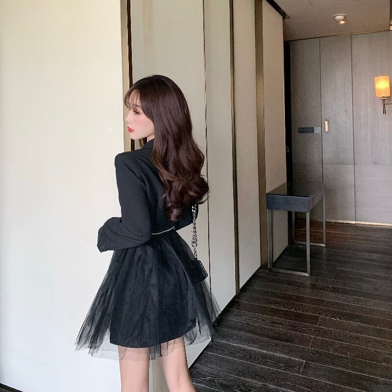 白いスーツの襟のドレス秋の長袖メッシュステッチショートスカート2020新しい妖精の気質の薄いスカート ブラックストロベリース57160033601