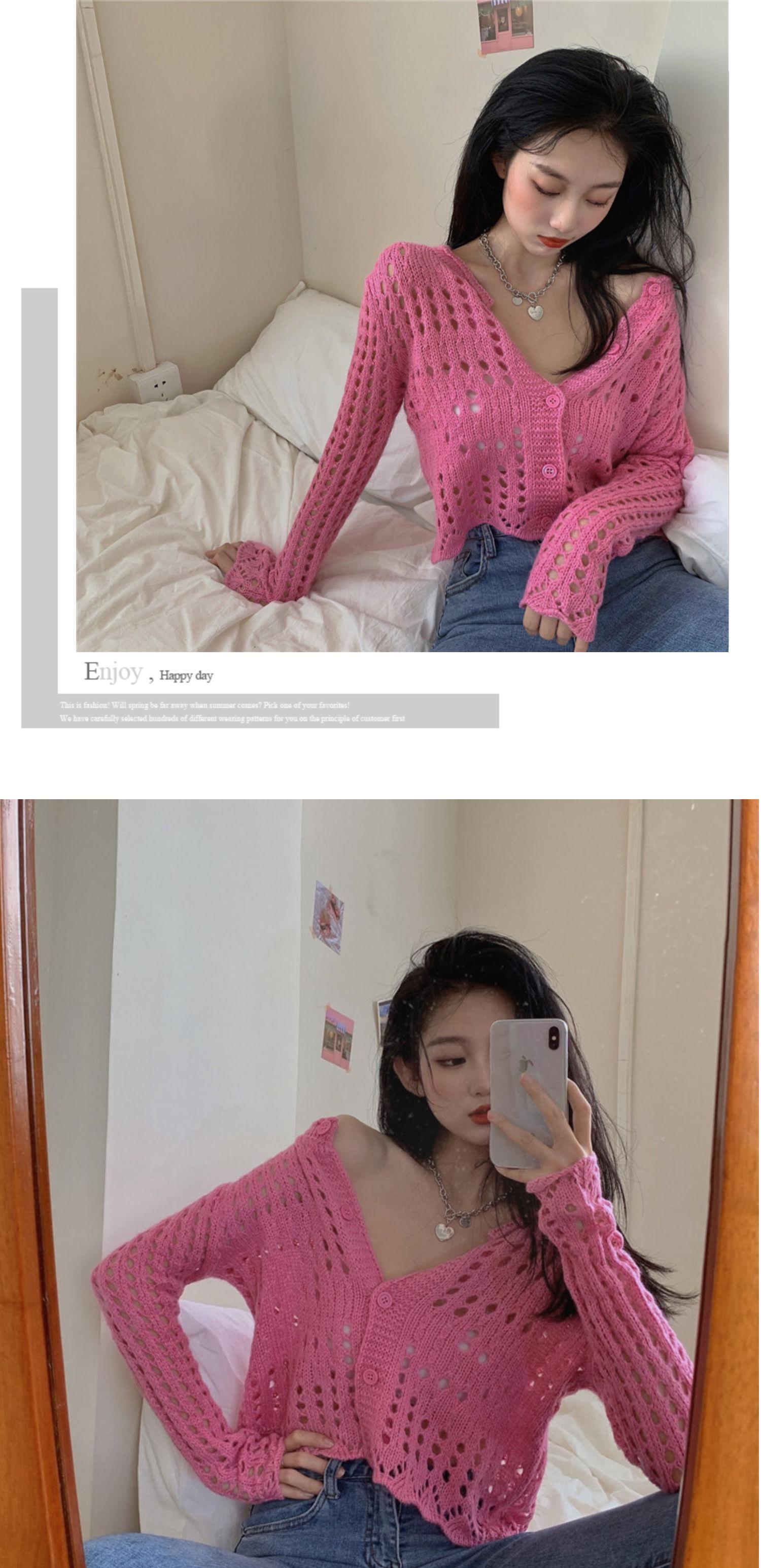 長袖中空Vネックピンクセーターレディース初秋ショートセクシールーズbmカーディガンジャケットコートセーター ブラックストロベリース37485476760