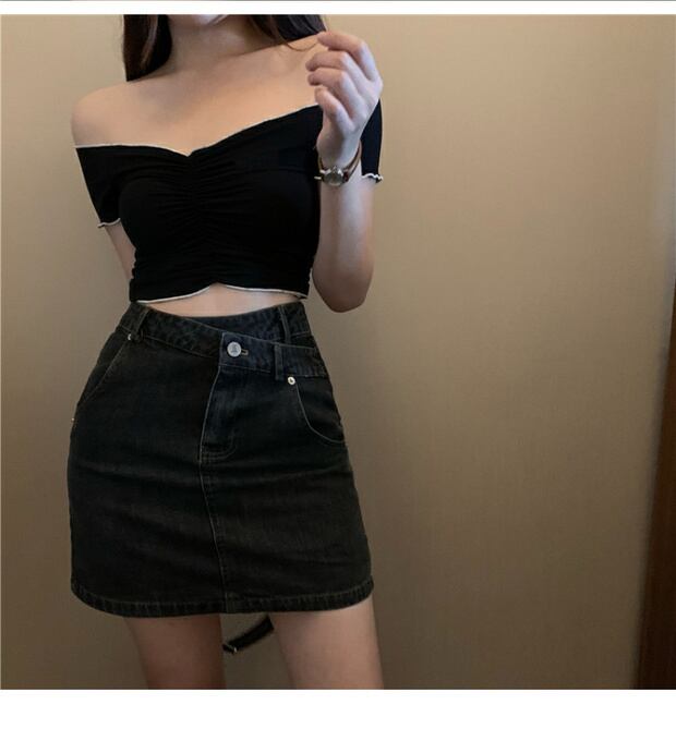 ブラックデニムスカート女性夏ハイウエスト細いaラインショートスカートバッグヒップ2020新しい薄い学生スカート ブラックストロベリース18542906938