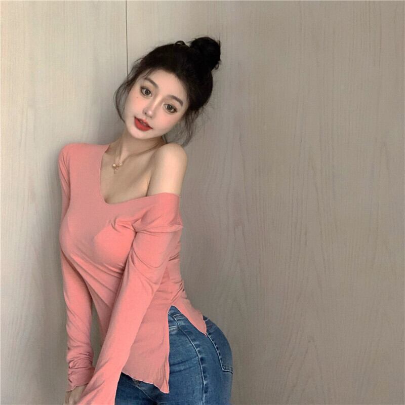 香港スタイルのレトロシックブルーVネックTシャツ女性秋長袖スリットタイトボトミングシャツ2020ニュートップ ブラックストロベリース52383855361