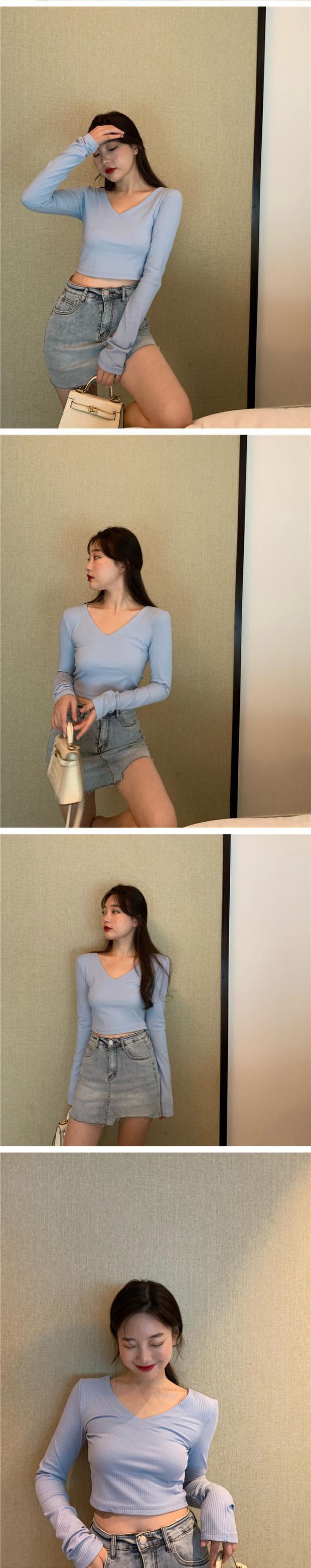 VネックショートセクシーおへそタイトフィットニットTシャツ女子2020年初秋新作ボトミングシャツスリム長袖トップトレンド ブラックストロベリース99023272242