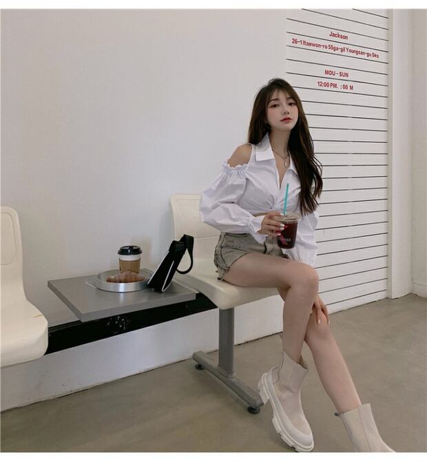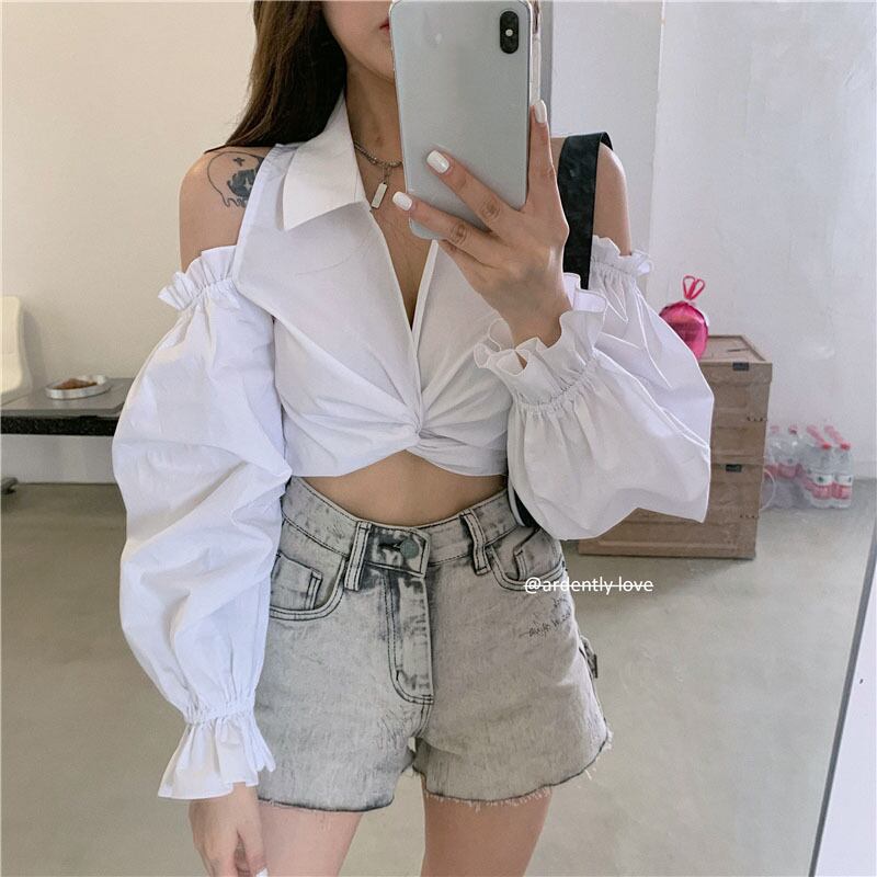 パフスリーブホワイトシャツ女性秋デザイン気配りのセンスセクシーなストラップレス長袖シャツニッチショートトップ ブラックストロベリース27616670131