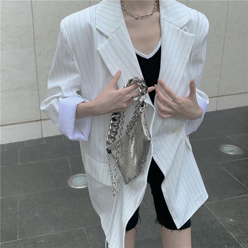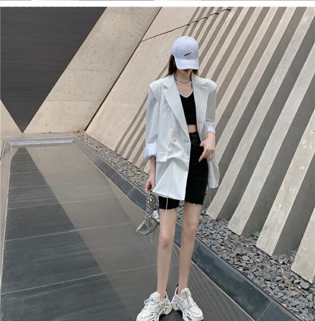 ストライプスモールスーツジャケットレディース秋シンルースミドル丈スタイルジャケット2020ニューホワイトスーツ ブラックストロベリース13002894475