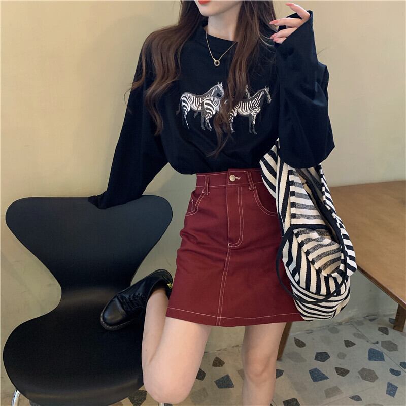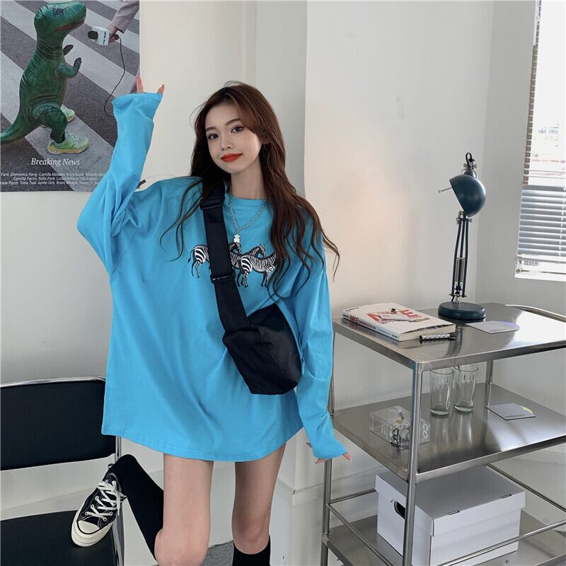 ゼブラ柄Tシャツレディース秋の学生ルーズで怠惰なスタイルの長袖ミドル丈ブラックトップインタイド ブラックストロベリース75486659264