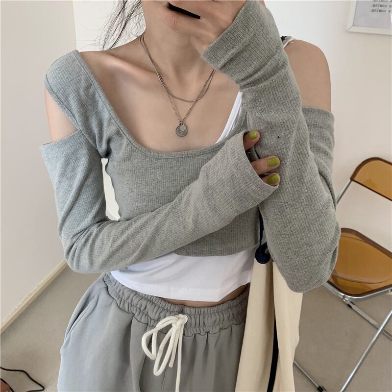 フェイク2枚のブラックオフショルダー長袖Tシャツレディース秋のデザインセンススリムボトミングシャツセクシーインナーショートトップ ブラックストロベリース2177219609