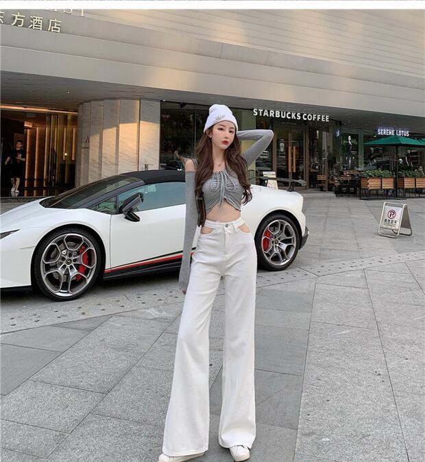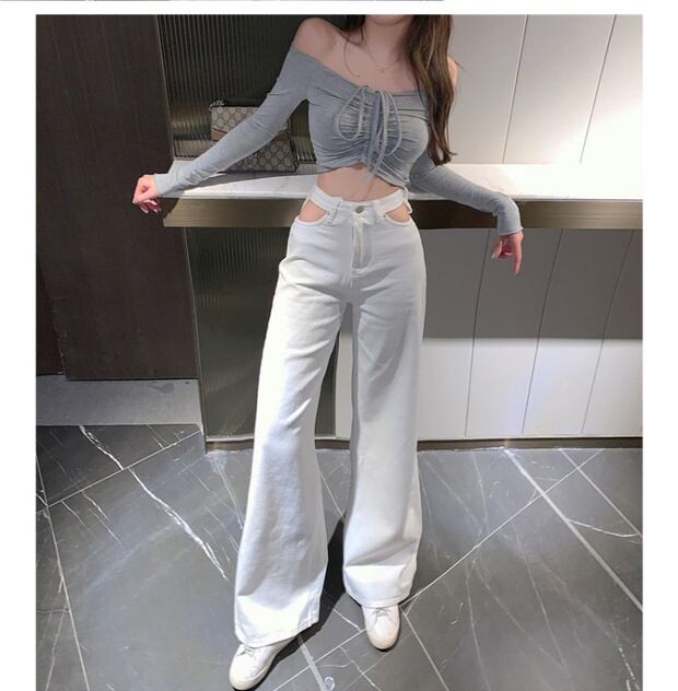 -ウエストカットアウトワイドレッグジーンズレディース2020年秋新作ルーズストレートパンツホワイトスリムパンツ ブラックストロベリース89361462156