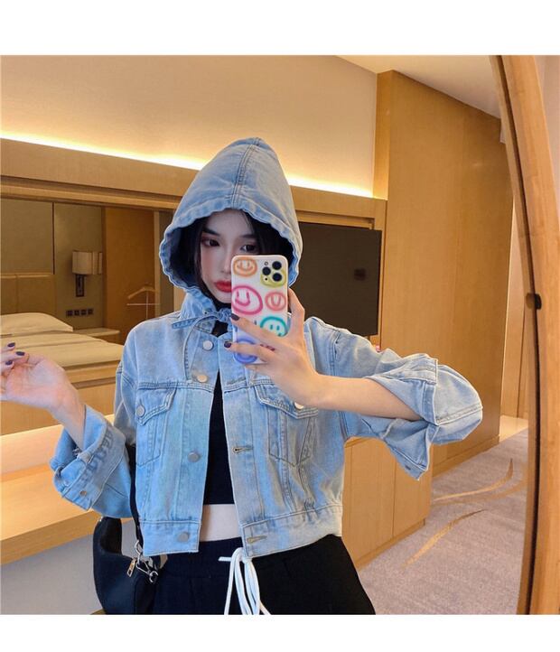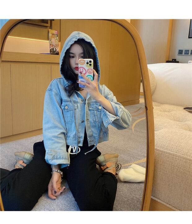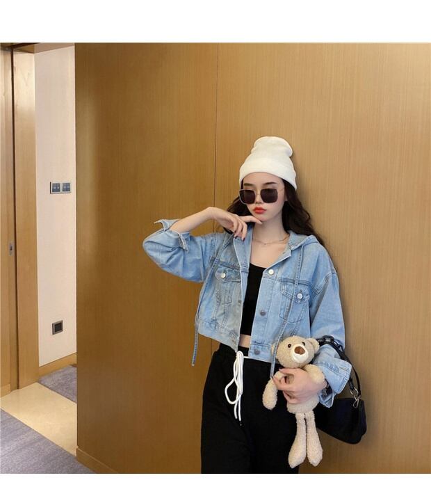 フード付きデニムジャケットレディース秋の長袖ルーズカーディガン2020新しいアウターショートトップイントレンド ブラックストロベリース6222759103