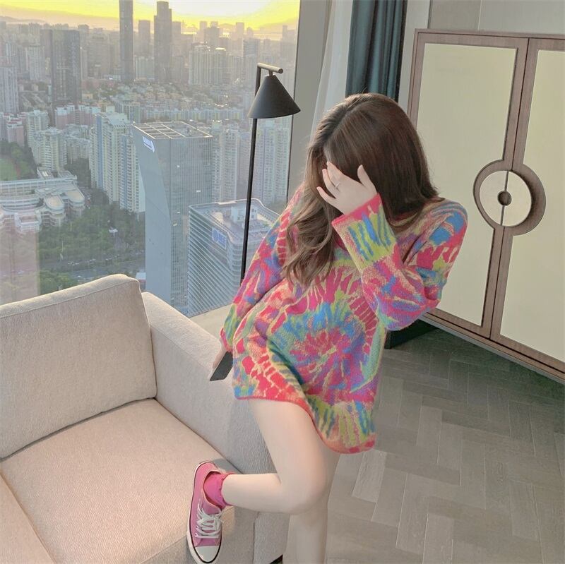 カラフルな絞り染めのニットセーターの女性は、ゆったりとした怠惰なスタイルの長袖プルオーバージャケット2020新しいアウタージャケットに落ちる ブラックストロベリース74740524454